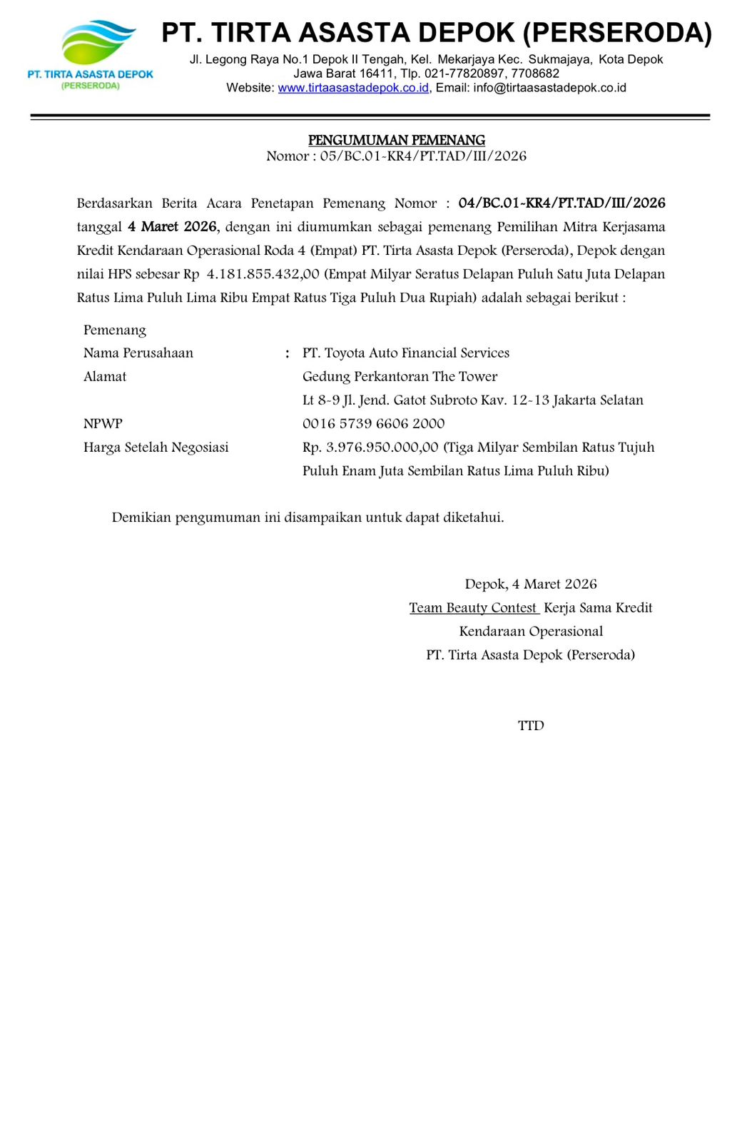 Pengumuman Pemenang Seleksi Beauty Contest